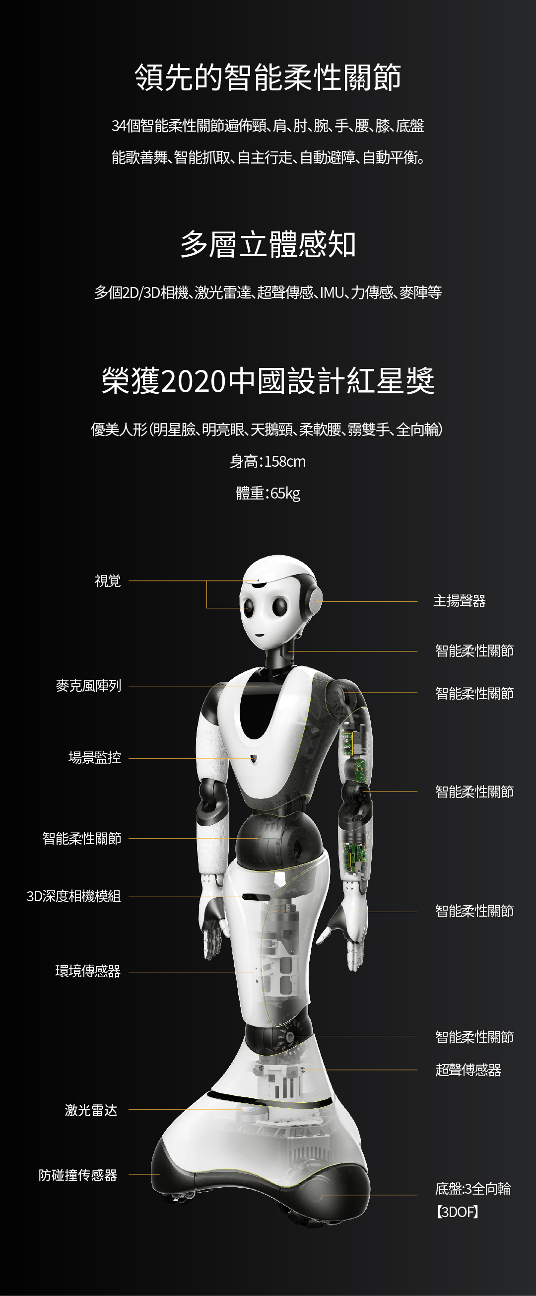 34個智能柔性關節(jié)遍布頸、肩、肘、腕、手、腰、膝、底盤