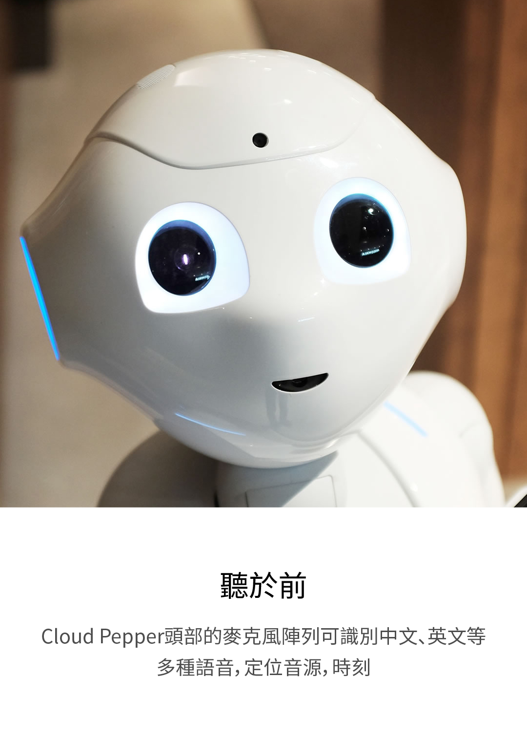 Cloud Pepper頭部的麥克風陣列可識別中文、英文等多種語音,定位音源,時刻