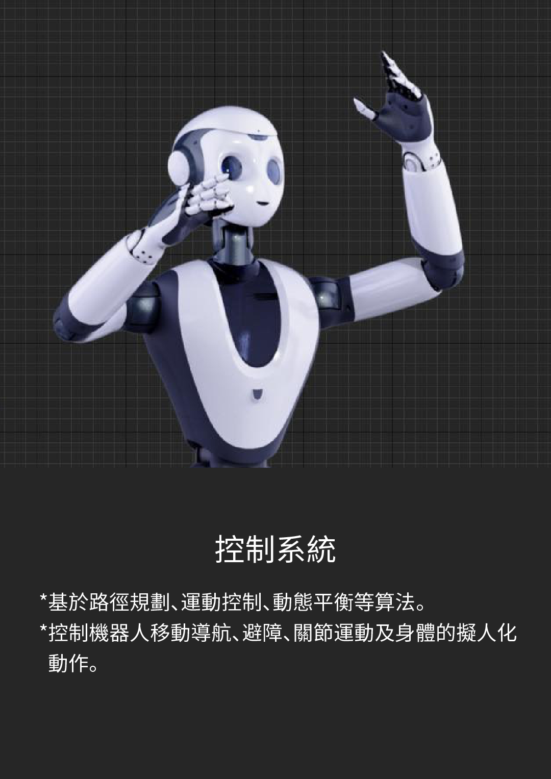 *控制機器人移動導航、避障、關節運動及身體的擬人化動作。