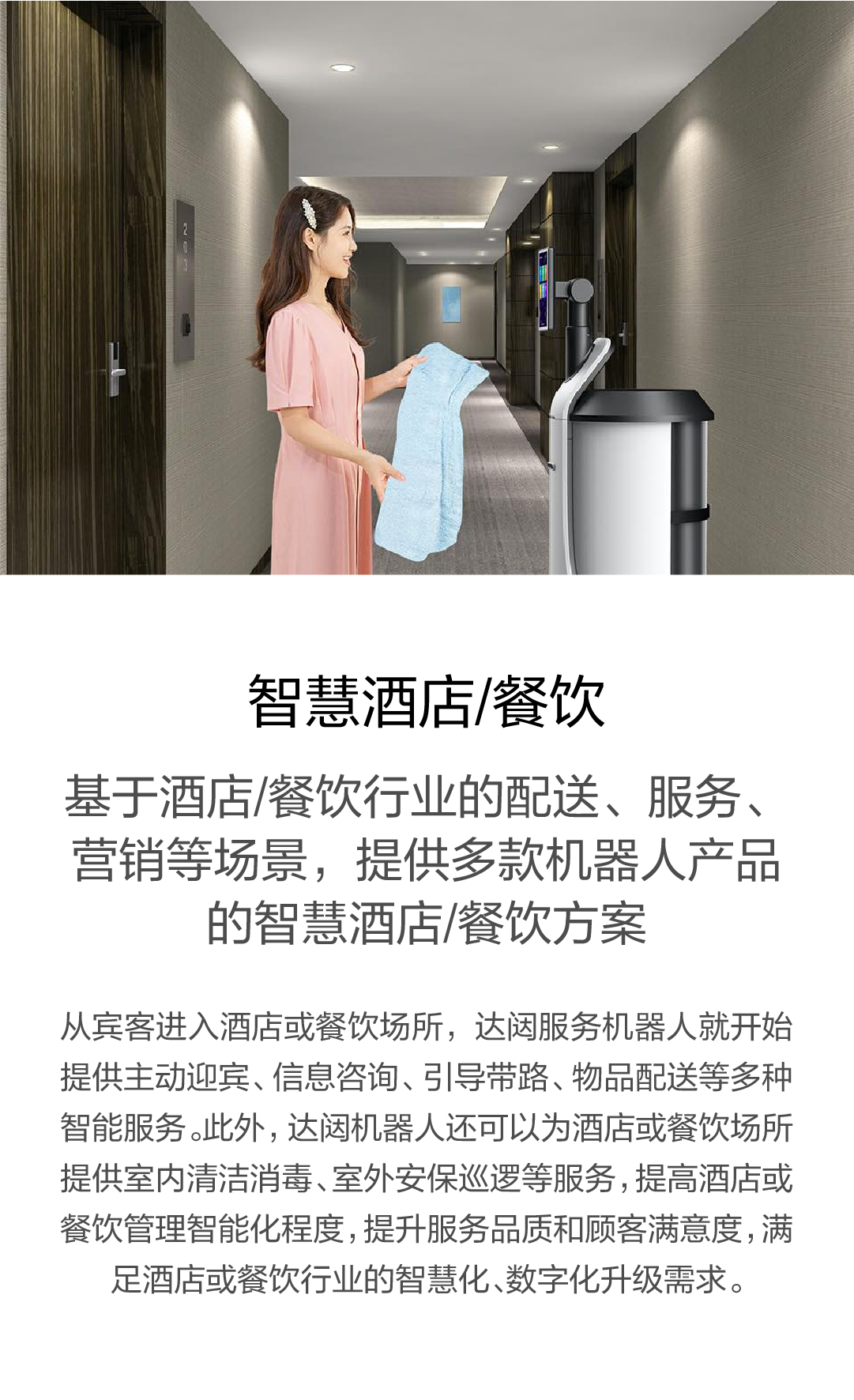 基于酒店/餐飲行業的配送、服務、營銷等場景,提供多款機器人產品的智慧酒店/
